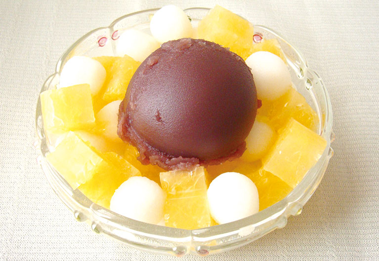 ②Bを耳たぶくらいの固さにこね、小さく丸めて茹でて水にとって冷まします。1.5cm角に切った①と一緒に盛り、つぶあんを乗せます。