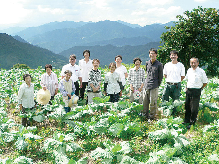 青汁の原料野菜を栽培しているのは、高知県の山間部、大豊町の「ひまわり健康づくりの会」の30軒の契約農家です。害虫や病気のこない山間地の冷涼な環境を活かし、無農薬栽培です。農家に対して栽培管理を共通化しています。この企画がスタートした時には、ひまわり乳業のスタッフがケールの種蒔きをしました。ひまわり乳業が、それら栽培された野菜を庭先で集荷しています。
