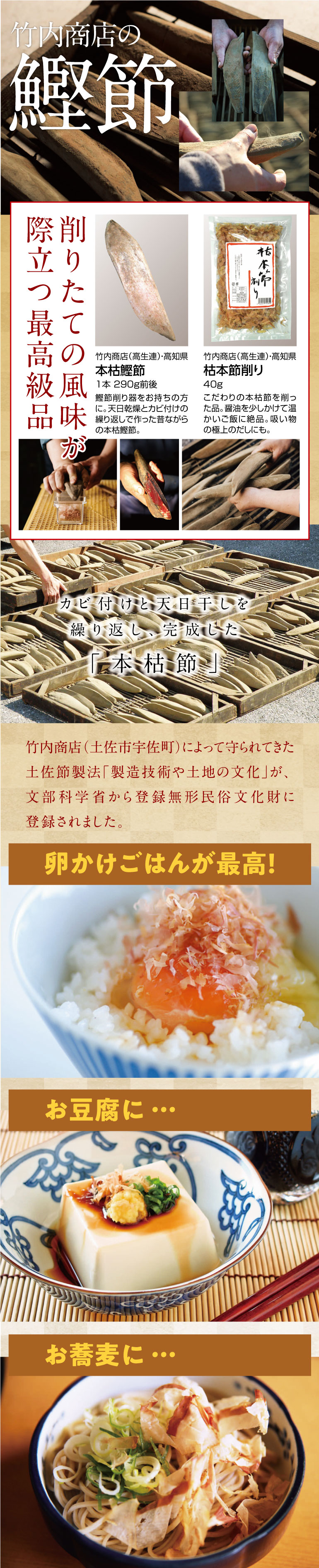 竹内商店の「カビ付け本格派の鰹節」は丁寧に時間をかけて行う焙乾、カビ付け、天日干しの工程を経て、約6ヶ月もの期間をかけて仕上げられ、その風味は絶品、まさに鰹節職人の技が光る逸品です。