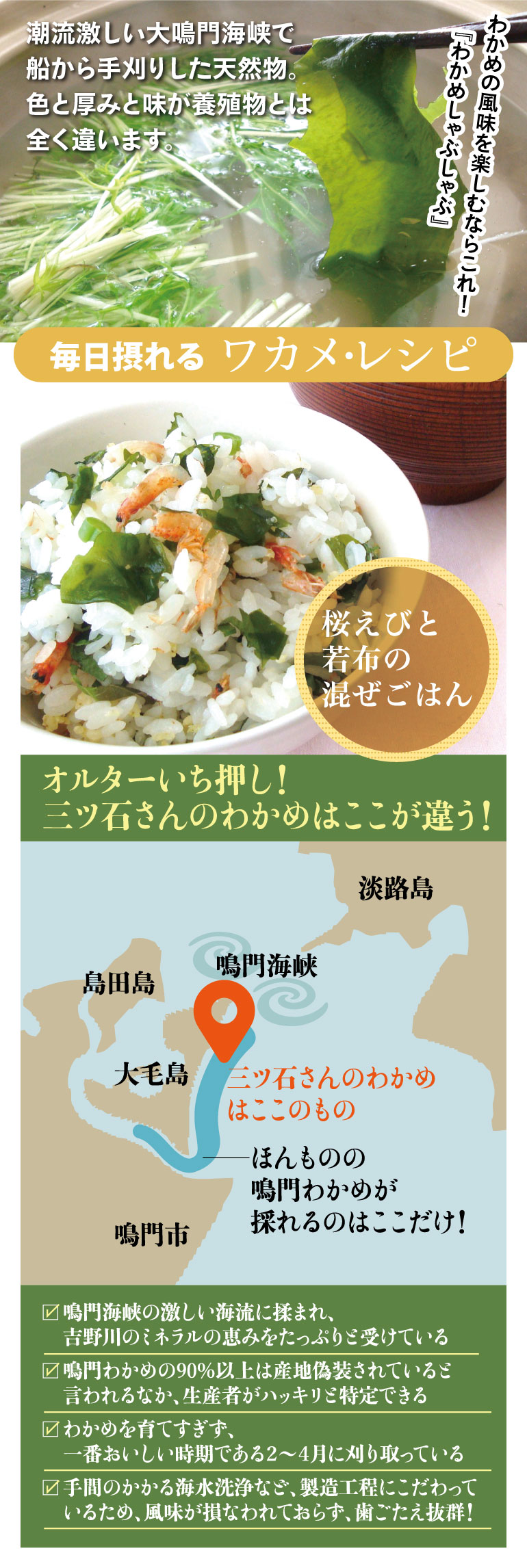 海藻という日本の伝統食材の柱・海藻の主役的存在です。味噌汁、海藻サラダ、麺類などで毎日の食卓に欠かせません。ミネラルやフコイダン(抗がん効果が認められている成分)がとくに注目される栄養成分です。三ッ石さんのおいしい本場の鳴門ワカメを伝統的食生活復活の強い味方として、ぜひご活用ください。