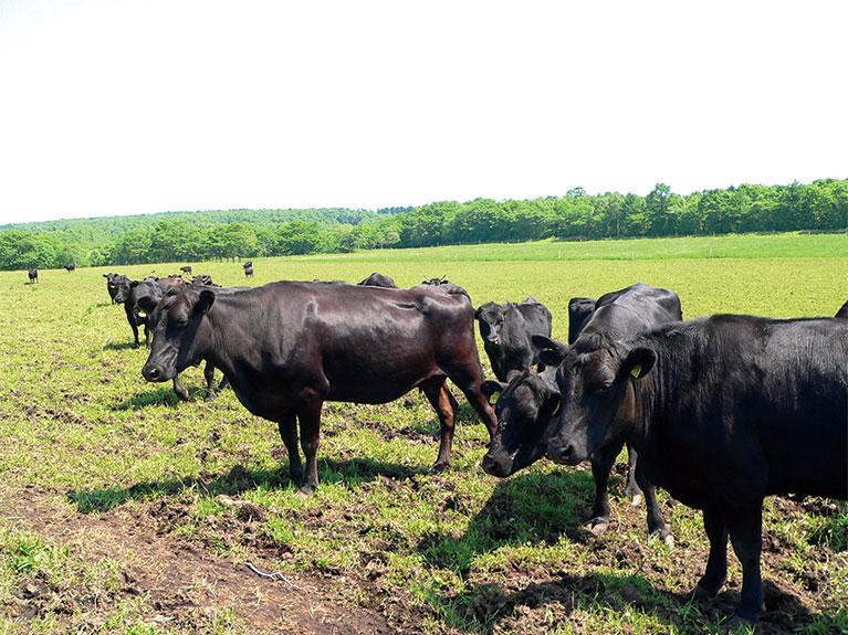ブラックアンガス牛は、肥育仕上げの段階に入った牛以外はすべて夏場は農薬、化学肥料を一切使用しない有機栽培牧草(チモシー、イタリアンライグラス、オーチャード、クローバーなど)や雑草(フキ、クマザサ、ダイオウ、ヨモギ、オオバコなど)を食べて放牧地で過ごします。穀物飼料は全く与えていません。