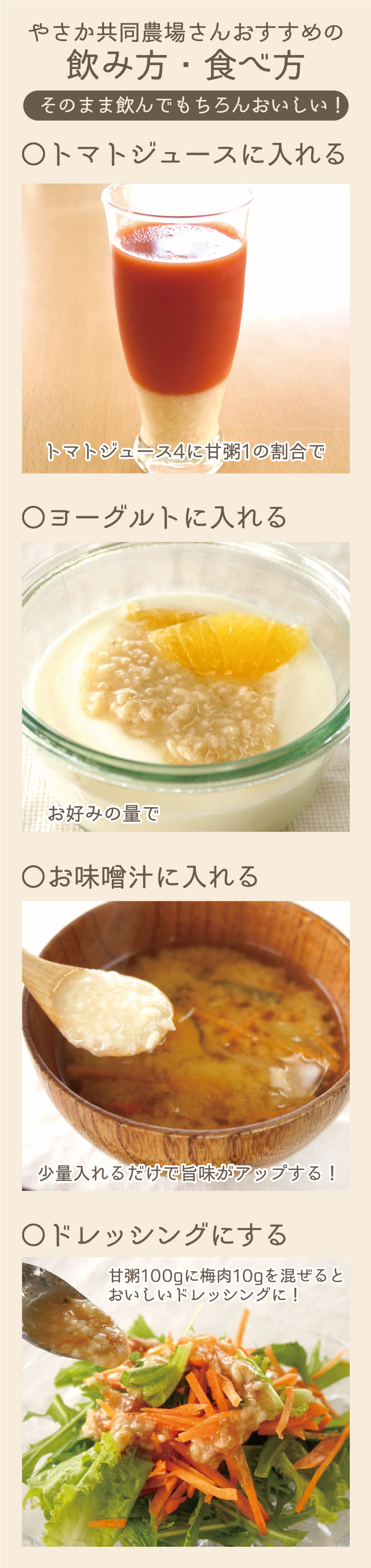 夏は冷やして、冬は温めて。お好みでおろし生姜やきな粉を入れたり、トマトジュースで割ったり、青汁スムージーにしたり、豚汁に入れたり…。甘味調味料として、しゃぶしゃぶのタレなどに加えても使えます。アイデア次第で飲み(食べ)方は無限に拡がります。やさか共同農場は「食べる甘酒」をコンセプトにしています。