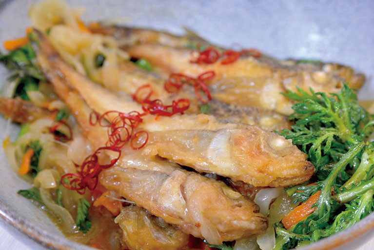 魚種は季節によりさまざまです。カレイ(ササ、ミズ、エテ)、ノドグロ(アカムツ)、ハタハタ、トビウオ、キス、レンコダイ、カマス、イワシ、アジ、サバ、アマダイ、サワラ、ユメカサゴ、タラ、スルメイカなど。最近は魚期、魚種が異常だったり、漁獲が減ったりしています。