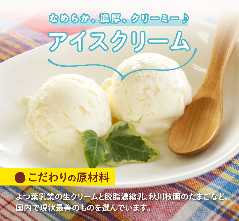 アイスクリームの原料は、よつ葉乳業の生クリームと脱脂濃縮乳、秋川牧園のたまご(ポストハーベスト農薬フリー、非遺伝子組み換え)など、国内で現状最善のものを選んでいます。