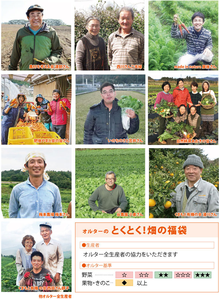 農薬や化学肥料を使わず、放射能や硝酸塩の心配のないオルター取扱水準の農産物を、台所目線でセットにした、オルター最安値農産物セット「とくとく!畑の福袋」の企画を始めます。