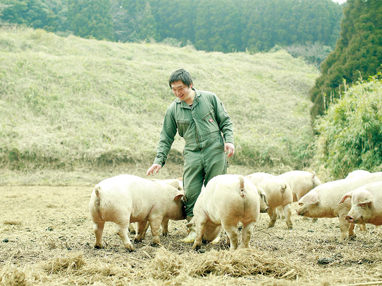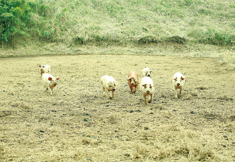 熊本県菊池市の標高400mの山あいにある牧場、「やまあい村」の武藤 勝典さんは、基本はポストハーベスト農薬フリー、非遺伝子組み換えの輸入のエサですが、できるだけ国産、できるだけ九州産、できるだけ菊池産の安全なエサを与え、山あいの畑、クヌギ山、栗山、竹林などの放牧場に豚を放し飼いにして、ストレスフリーで「走る豚」を育てています。放牧場ではピンク色の元気な肌をした豚たちが文字通り走り回っています。