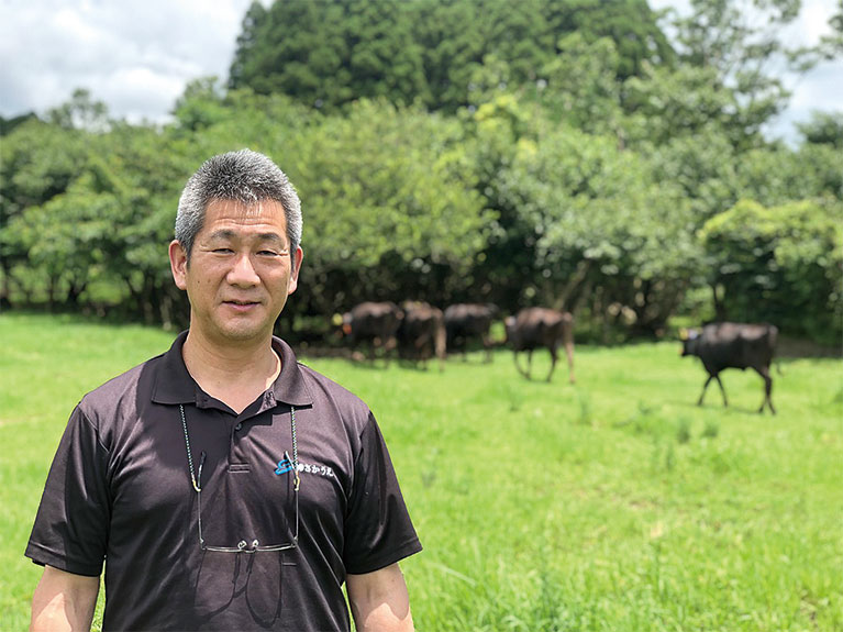 鹿児島県志布志市にある、県内屈指の農業会社、(株)さかうえ、坂上 隆代表は、2019年9月より畜産事業を開始し、現在では九州産黒毛和牛120〜140頭を、志布志市の中間山地に広がる里山の、自社管理の160haの土地において約100ヵ所(15ha)の耕作放棄地を電気柵で囲った放牧地に、基本的に周年昼夜放牧して育てています。好きな時に食べ、好きな時に運動し、好きな時に寝るストレスの少ない飼育環境です。牛舎は1棟あり、体調を壊した牛を休ませるときに使います。