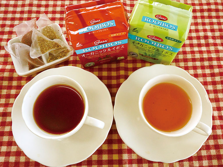 非発酵のグリーンルイボスも、ルイボス同様トップグレードの「グリーンマークJP16オーガニック」を選びます。あっさりとしたまろやかな風味が特徴です。抗酸化力はグリーンルイボスの方がさらに優れています。総ポリフェノール量は発酵タイプの約2〜4倍、フラボノイド量は10倍以上、アスパラチンは約80倍です。