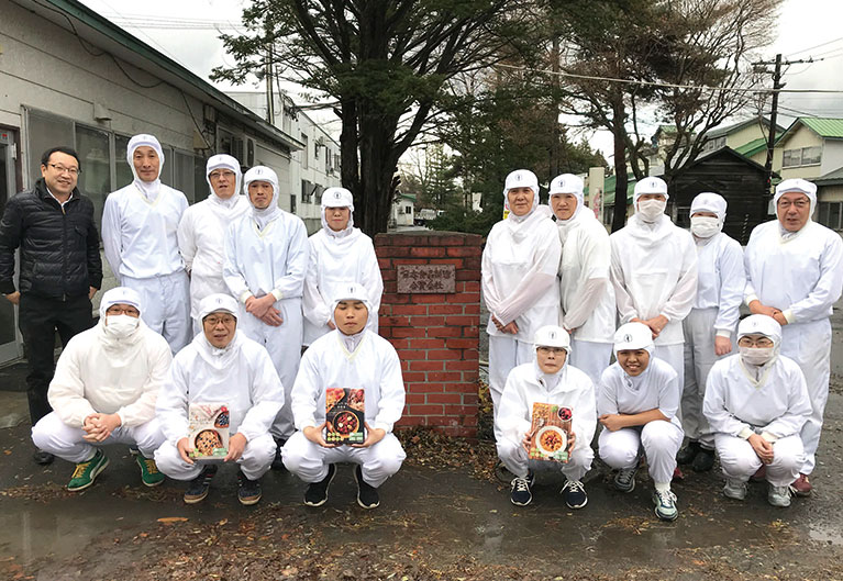 2017年12月3週号 戸部 謙ルイス代表(写真左後列)、工場長 黒瀨さん(右隅後列)、副工場長 佐藤さん(戸部代表の右隣)